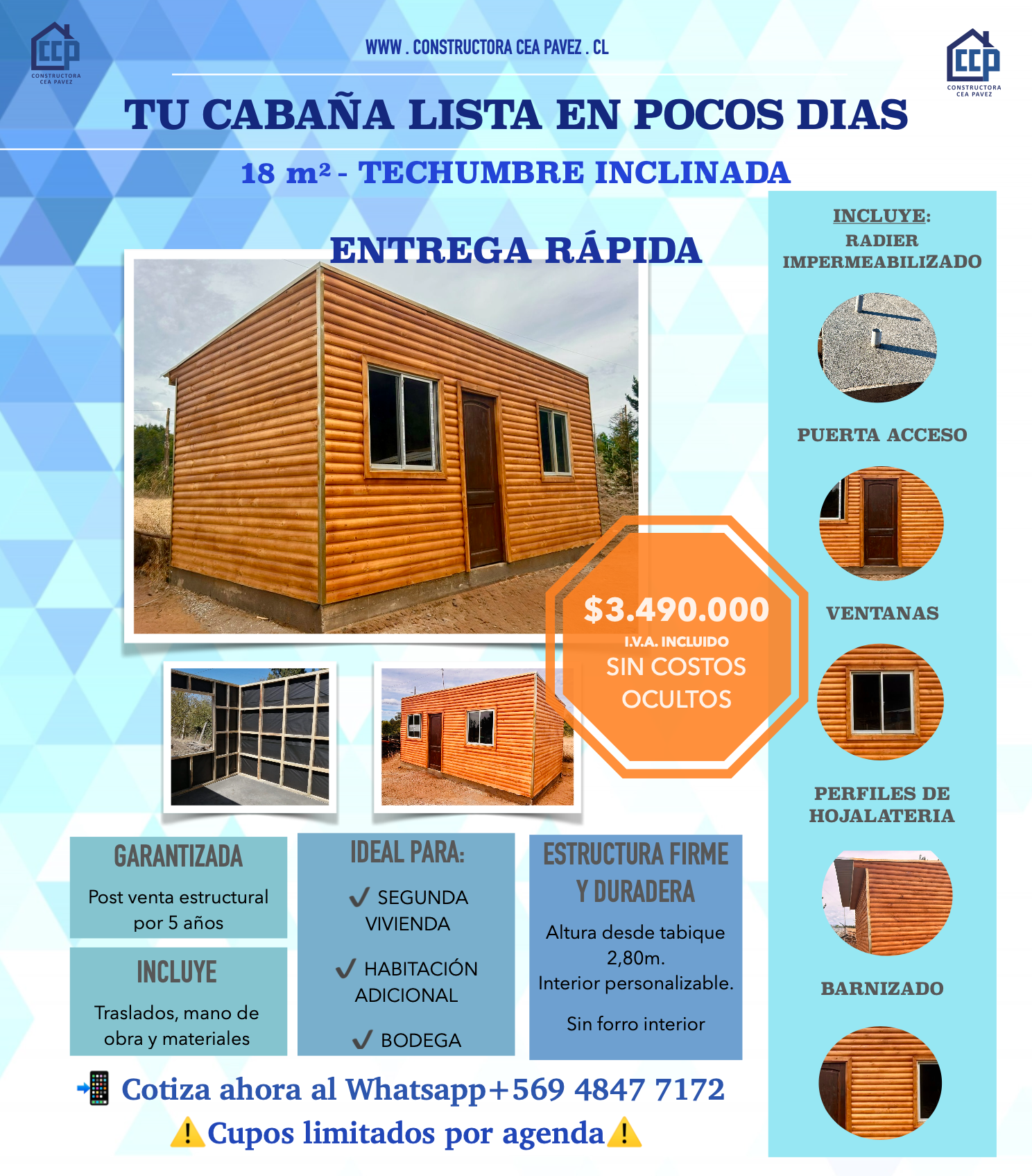 Considera radier, tabiquería, aislación termo-acústica, puertas exteriores, puertas interiores, ventanas, aleros y tapacanes. Además de canalización eléctrica y de agua fría/caliente.
